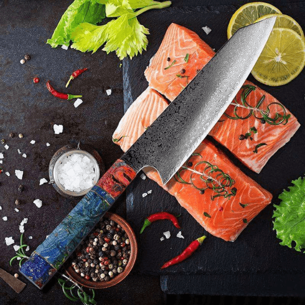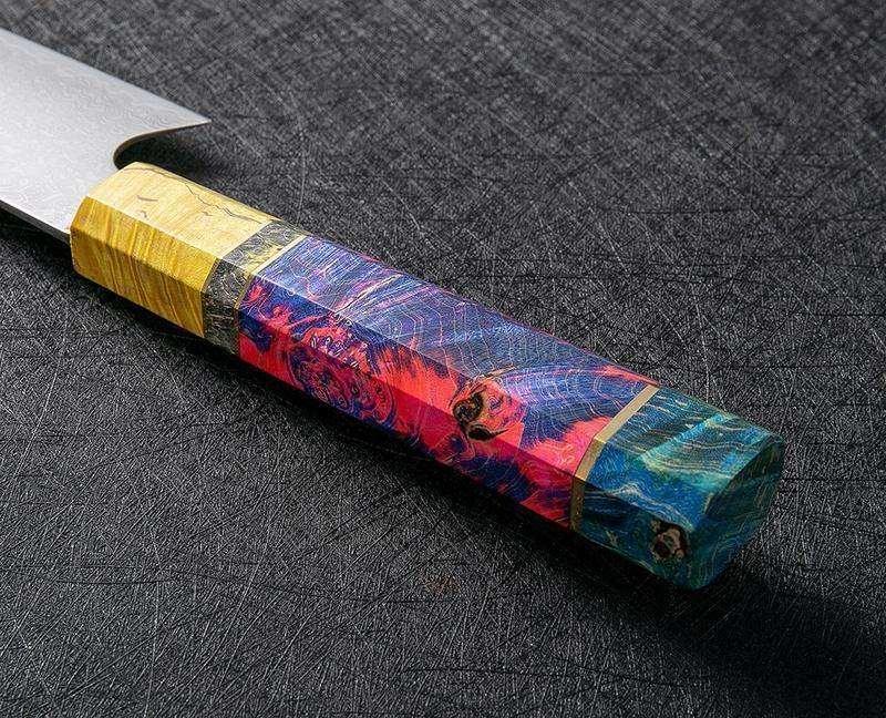 A lâmina de aço de Damasco foi artificialmente trabalhada pela técnica de forjamento de processamento de lentes em uma fábrica. A faca é bem equilibrada e fácil de usar para profissionais e entusiastas da culinária.